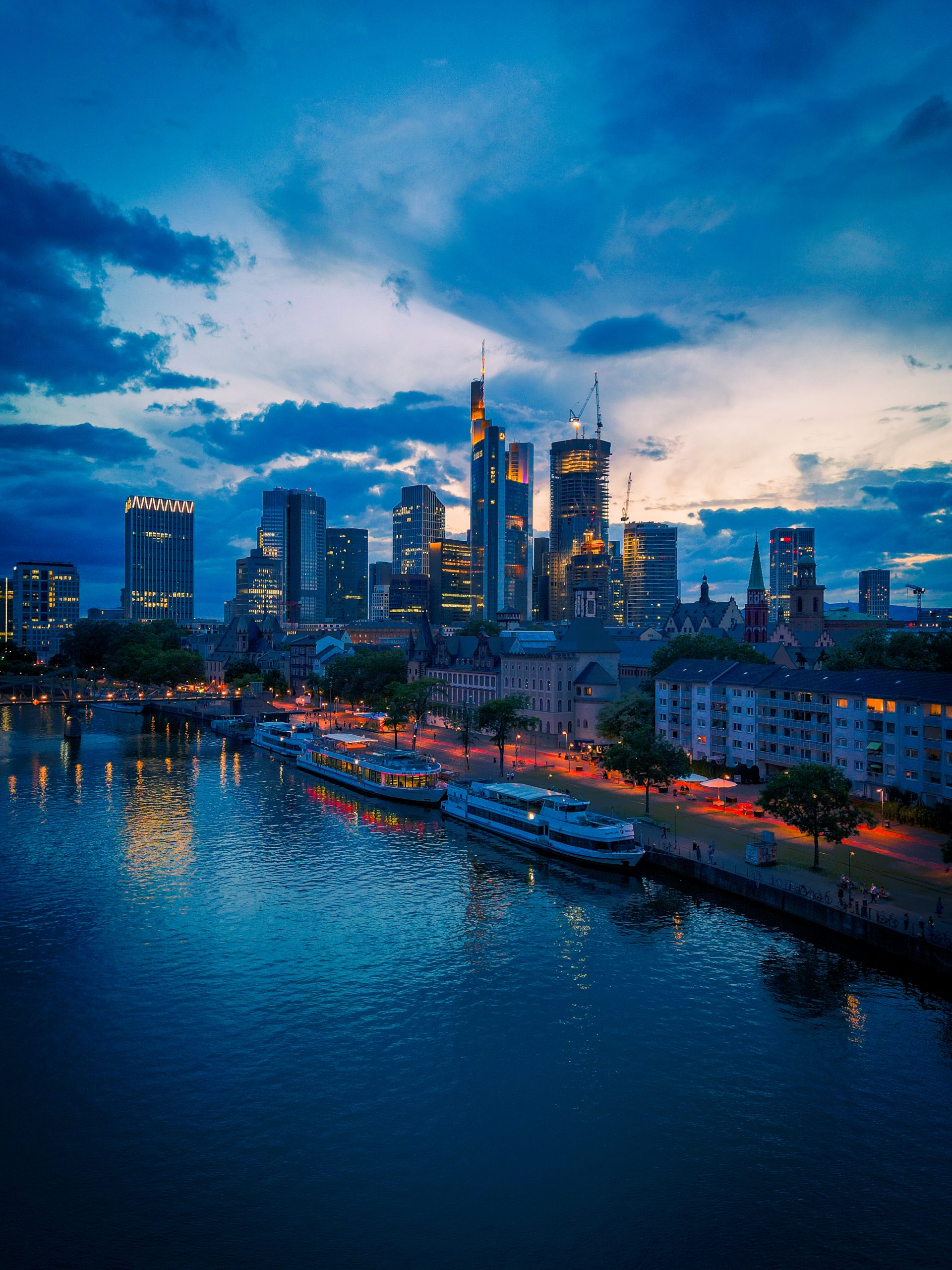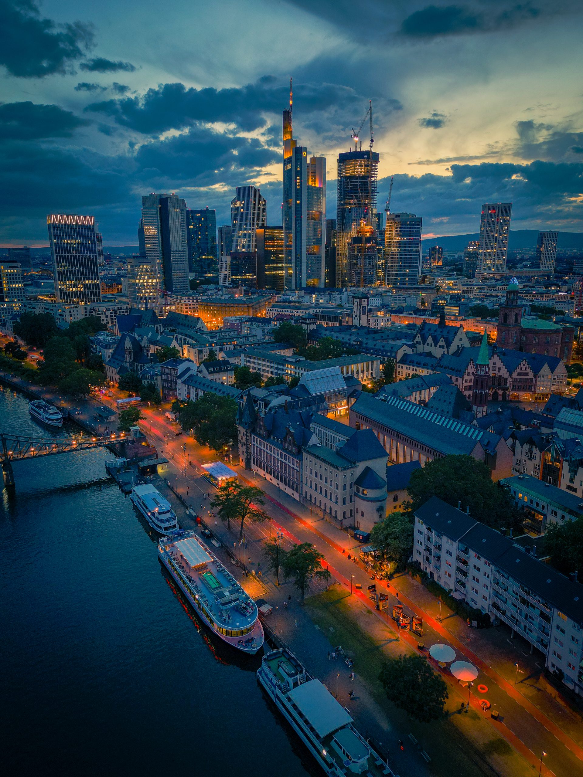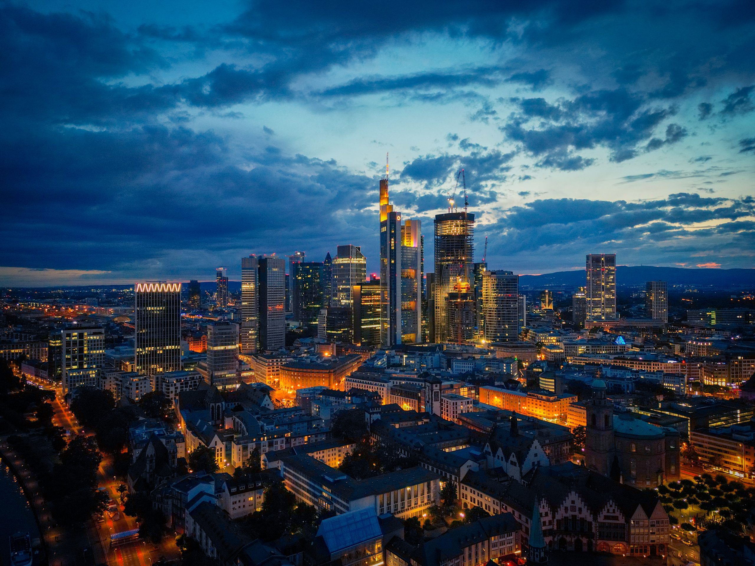 Die Frankfurter Skyline, eingefangen aus der Vogelperspektive, zeigt die beeindruckende Architektur und Dynamik der Mainmetropole.