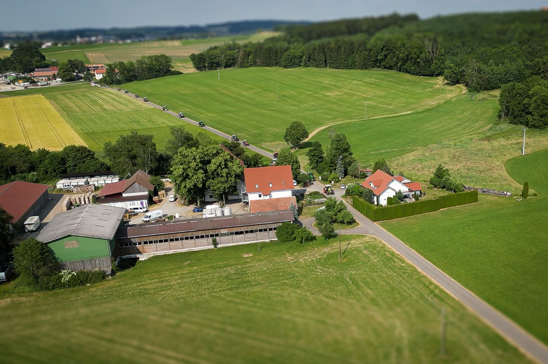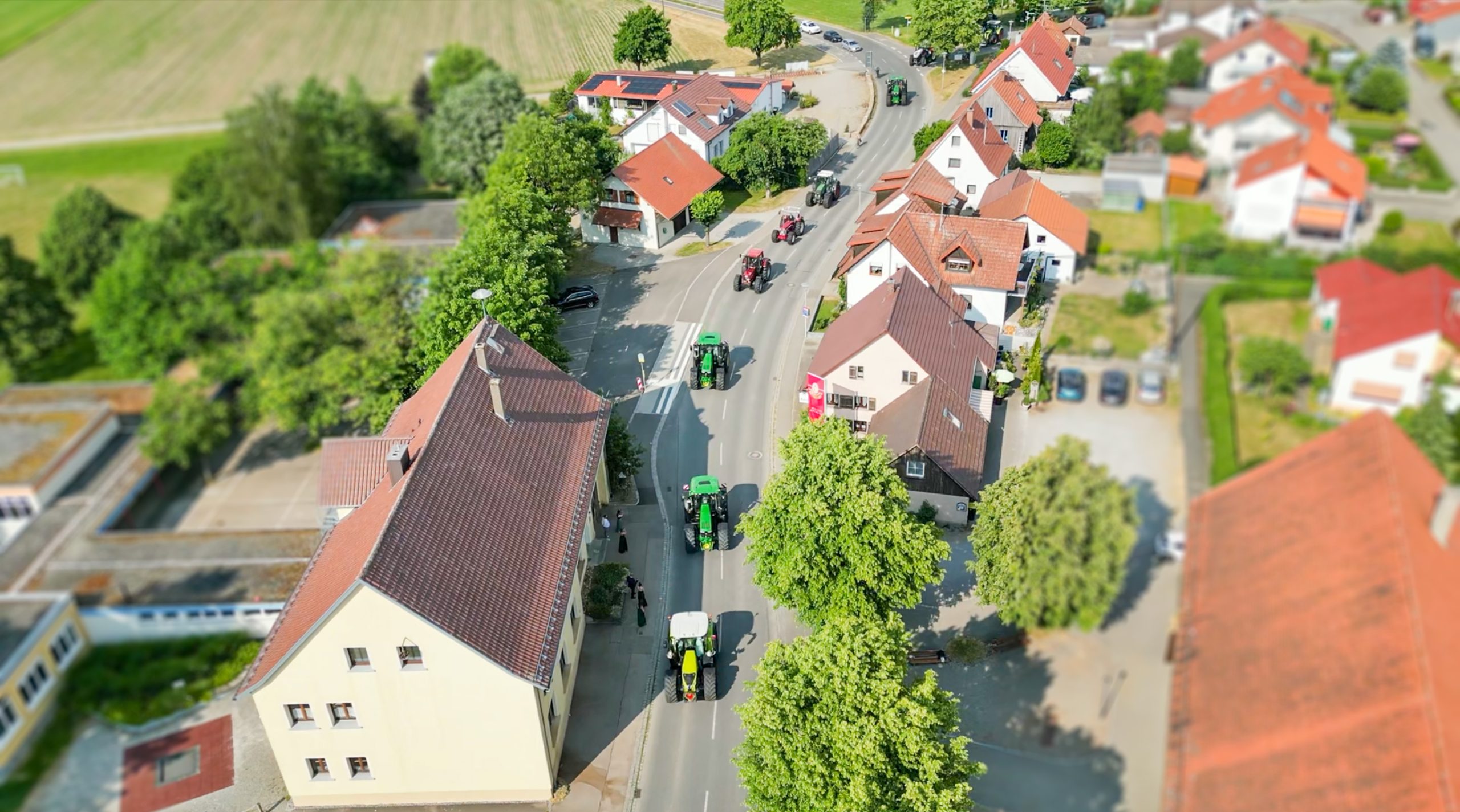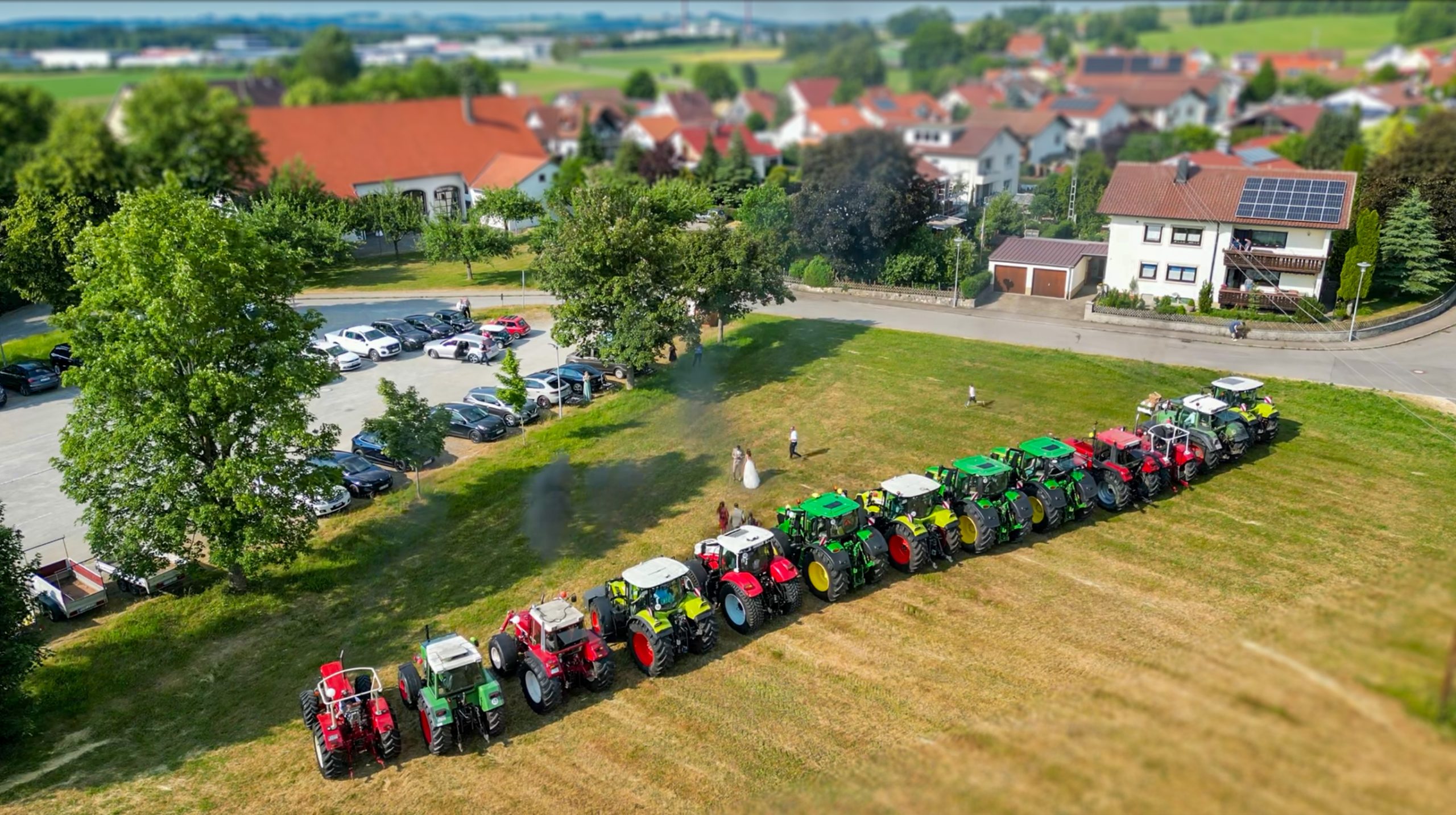 Drohnenfotografie einer Traktor-Parade bei einer Hochzeit